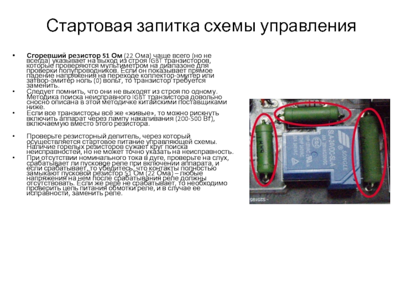 При отсутствии номинального тока в дуге, проверьте на слух, срабатывает ли пусковое реле при включении аппарата, и если срабатывает, то убедитесь, что контакты полностью замыкают пусковой резистор 51 Ом (22 Ома) – любые напряжения на нем после срабатывания реле должны отсутствовать. Если же реле не срабатывает, то необходимо проверить цепь питания обмотки реле, и в случае ее исправности, заменить реле.
