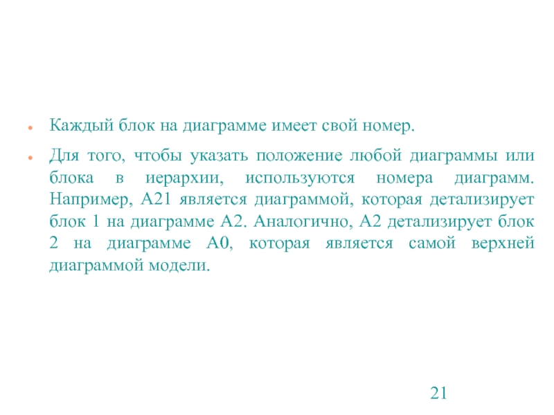 положение любой диаграммы или блока в иерархии, используются номера диаграмм. Например, А21 является диаграммой, которая детализирует блок 1 на диаграмме А2. Аналогично, А2 детализирует блок 2 на диаграмме А0, которая является самой верхней диаграммой модели.