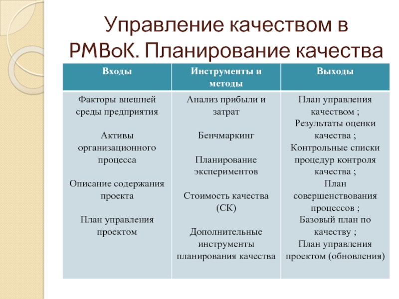 Слайд 23Управление качеством в PMBoK. Планирование качества
