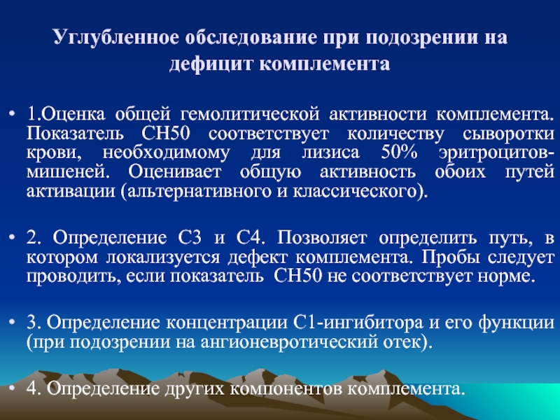 Слайд 33Углубленное обследование при подозрении на дефицит комплемента