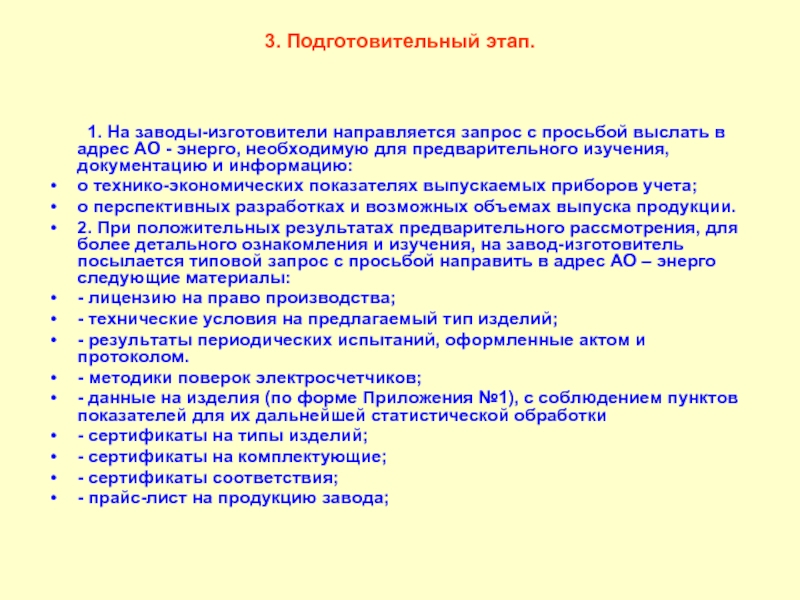 2. При положительных результатах предварительного рассмотрения, для более детального ознакомления и изучения, на завод-изготовитель посылается типовой запрос с просьбой направить в адрес АО – энерго следующие материалы: