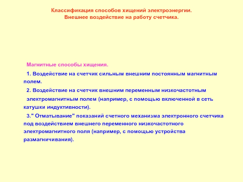 3." Отматывание" показаний счетного механизма электронного счетчика под воздействием внешнего переменного низкочастотного электромагнитного поля (например, с помощью устройства размагничивания).