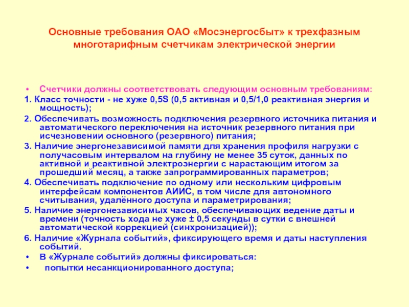 Слайд 78Основные требования ОАО «Мосэнергосбыт» к трехфазным многотарифным счетчикам электрической энергии