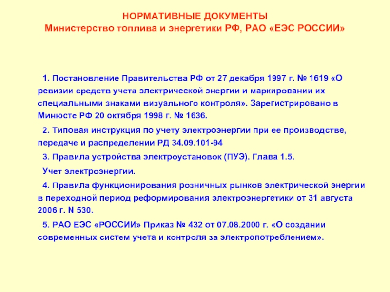 РФ от 27 декабря 1997 г. № 1619 «О ревизии средств учета электрической энергии и маркировании их специальными знаками визуального контроля». Зарегистрировано в Минюсте РФ 20 октября 1998 г. № 1636.