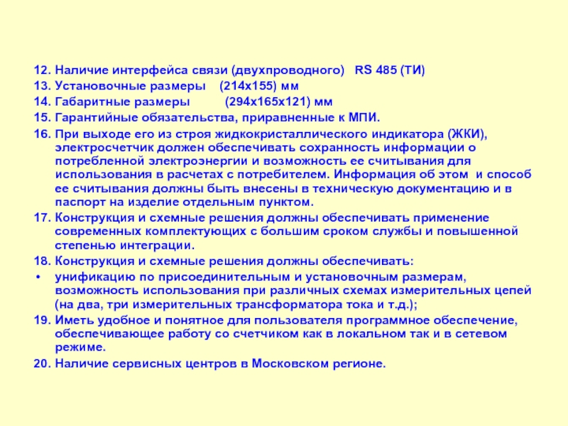 Слайд 8012. Наличие интерфейса связи (двухпроводного) RS 485 (ТИ)