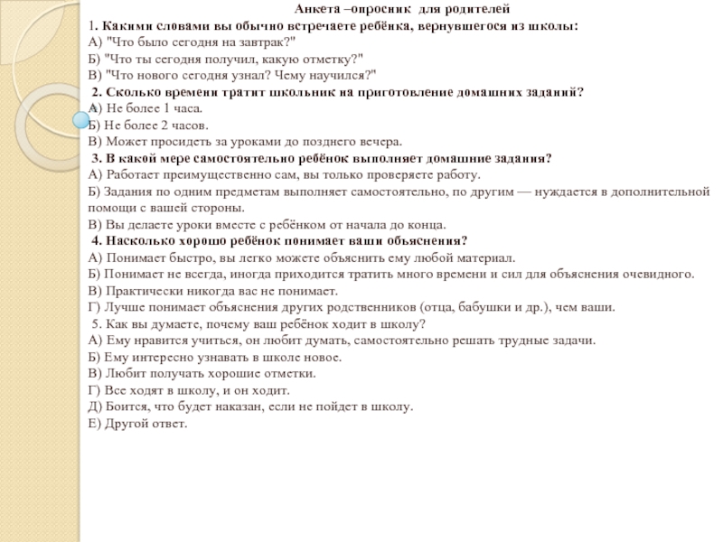 Слайд 7Анкета –опросник для родителей (продолжение)