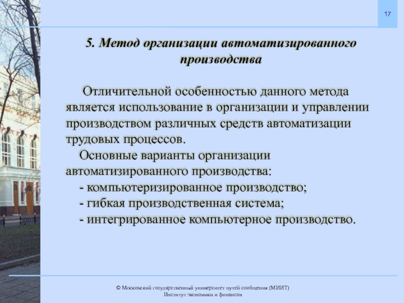 является использование в организации и управлении производством различных средств автоматизации трудовых процессов.