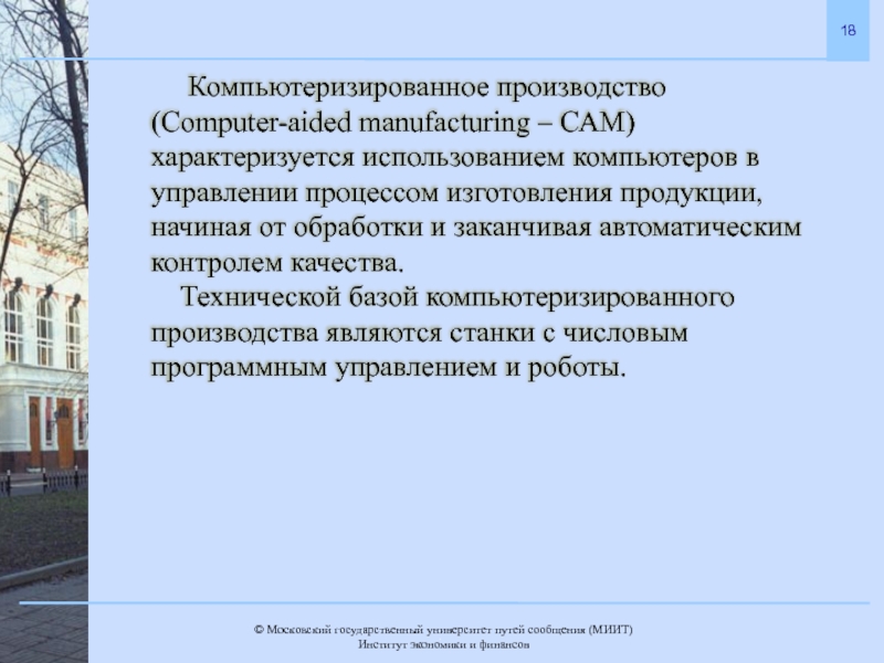 Слайд 18 Компьютеризированное производство (Computer-aided manufacturing – САМ) характеризуется использованием