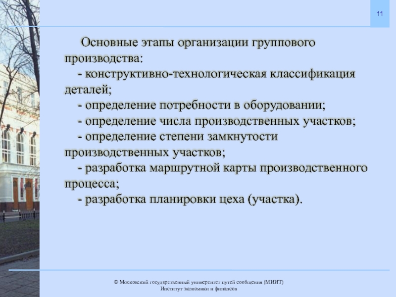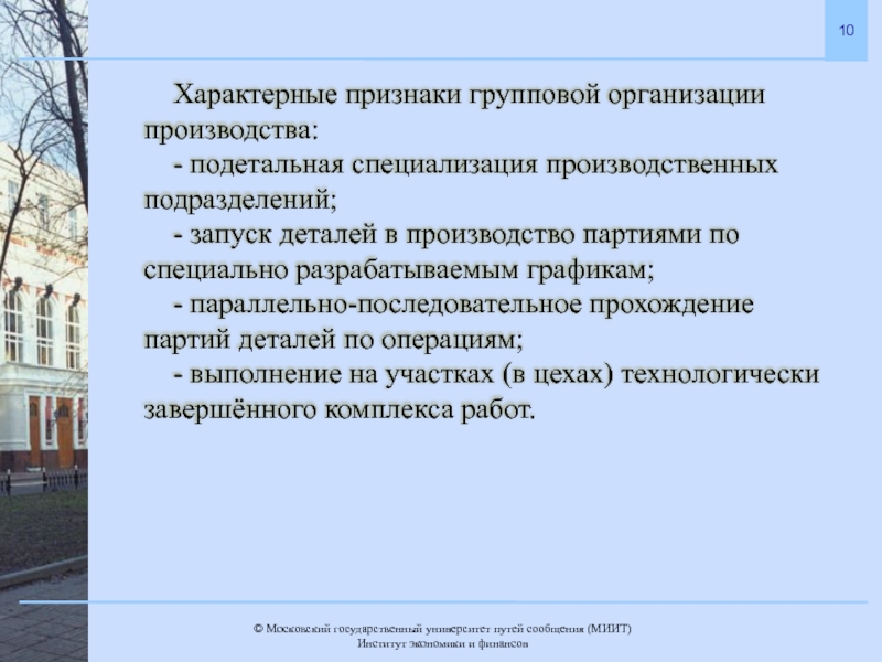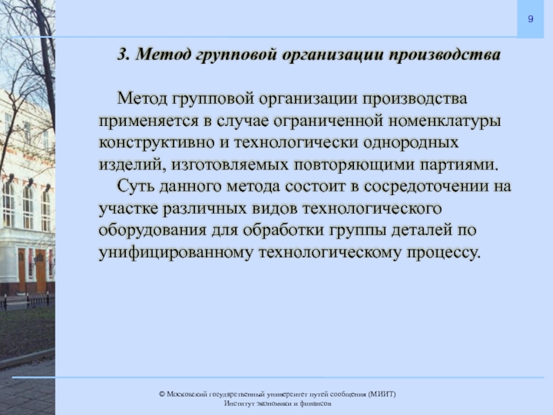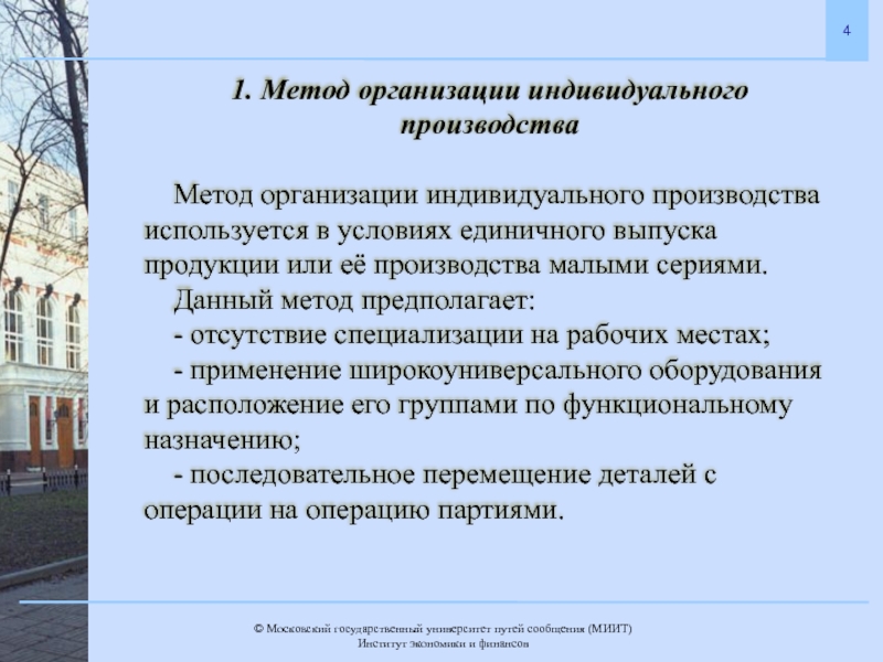 Данный метод предполагает совокупность следующих специальных приёмов организационного построения производственного процесса: