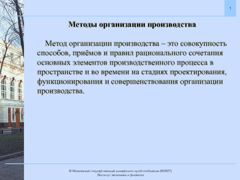 приёмов и правил рационального сочетания основных элементов производственного процесса в пространстве и во времени на стадиях проектирования, функционирования и совершенствования организации производства.