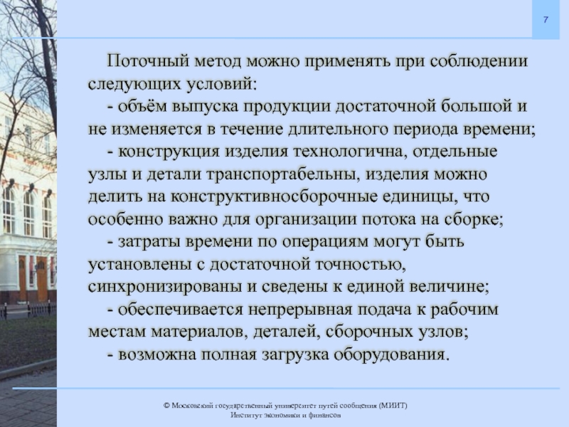 Слайд 7 Поточный метод можно применять при соблюдении следующих условий:
