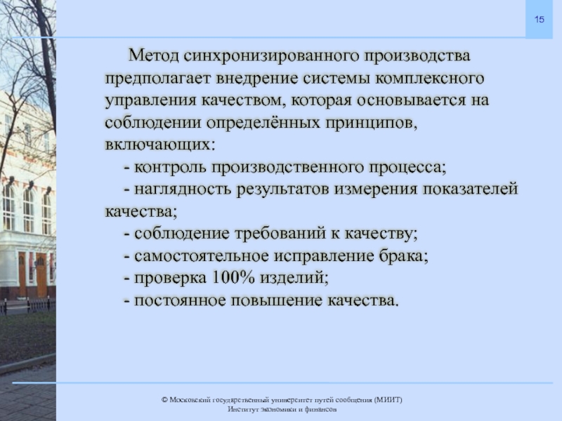 Слайд 15 Метод синхронизированного производства предполагает внедрение системы комплексного управления