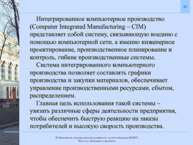 Слайд 20 Интегрированное компьютерное производство (Computer Integrated Manufacturing – CIM) представляет