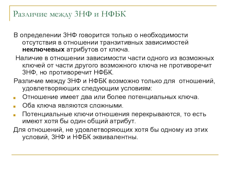 Все отношения находятся в 3НФ и не противоречат определению усиленной 3НФ или НФБК