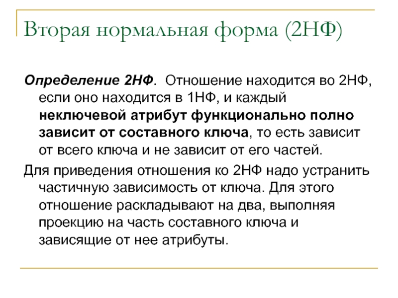 Определение 4НФ: Отношение находится в 4НФ, если оно находится в НФБК и в нем отсутствуют многозначные зависимости.