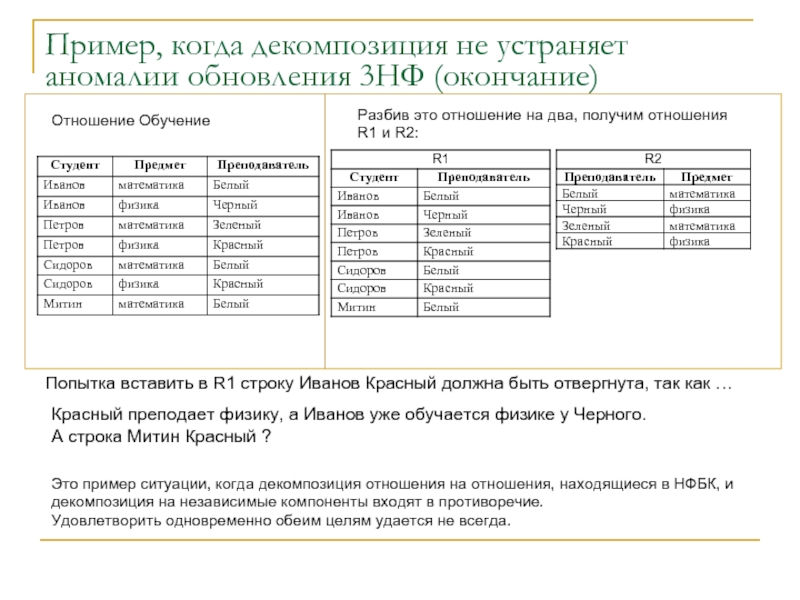 Это пример ситуации, когда декомпозиция отношения на отношения, находящиеся в НФБК, и декомпозиция на независимые компоненты входят в противоречие.
