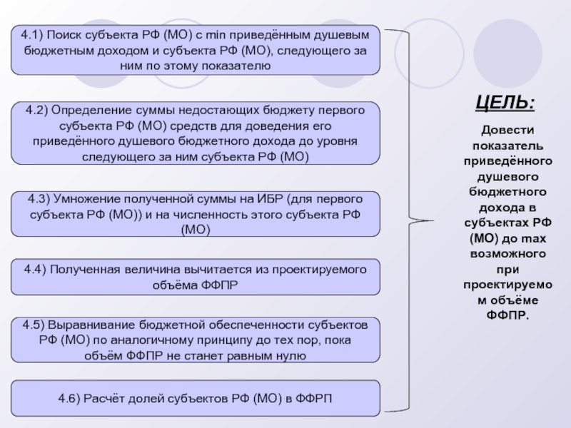 4.5) Выравнивание бюджетной обеспеченности субъектов РФ (МО) по аналогичному принципу до тех пор, пока объём ФФПР не станет равным нулю