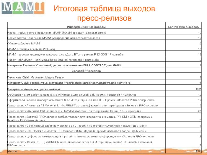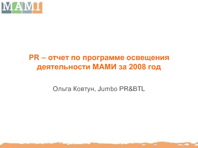 Слайд 89PR – отчет по программе освещения деятельности МАМИ за 2008 год