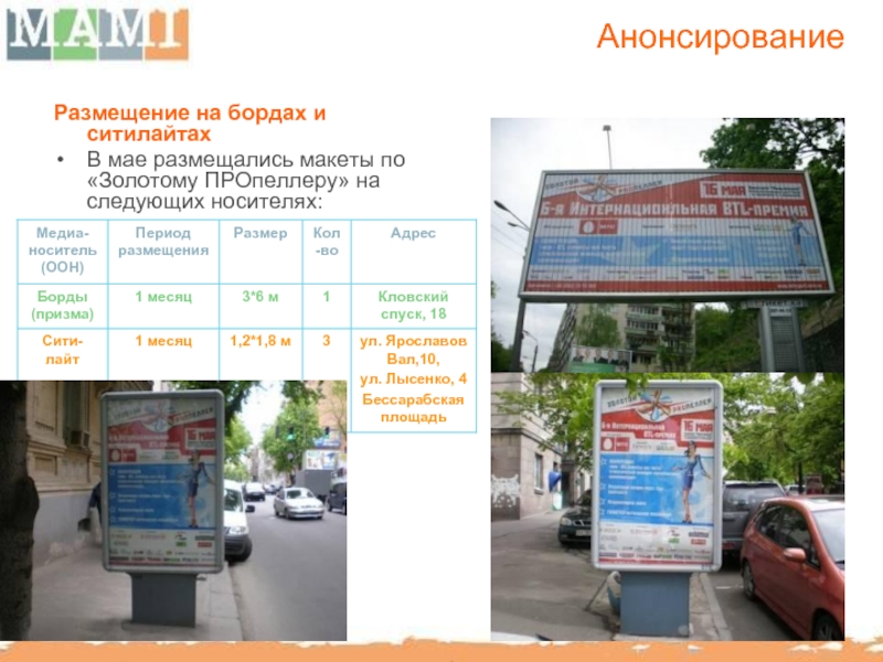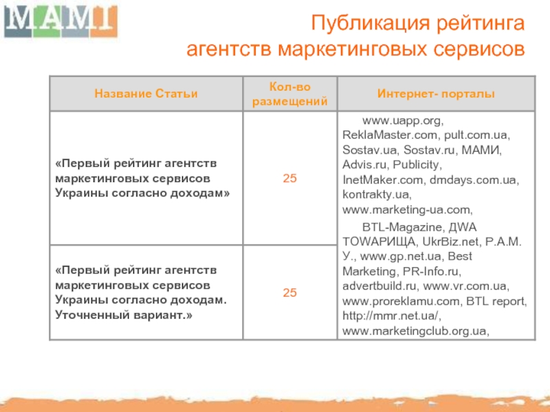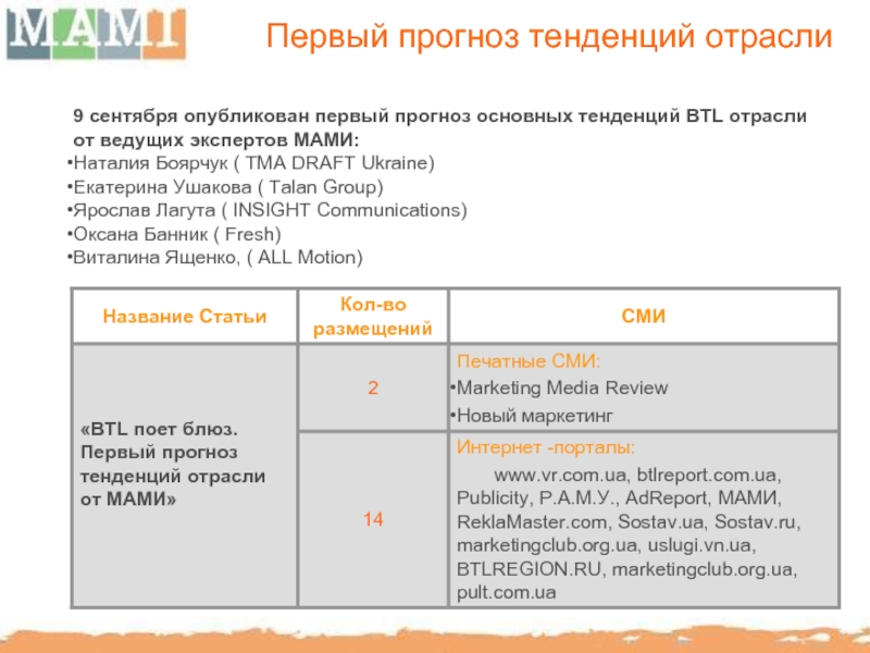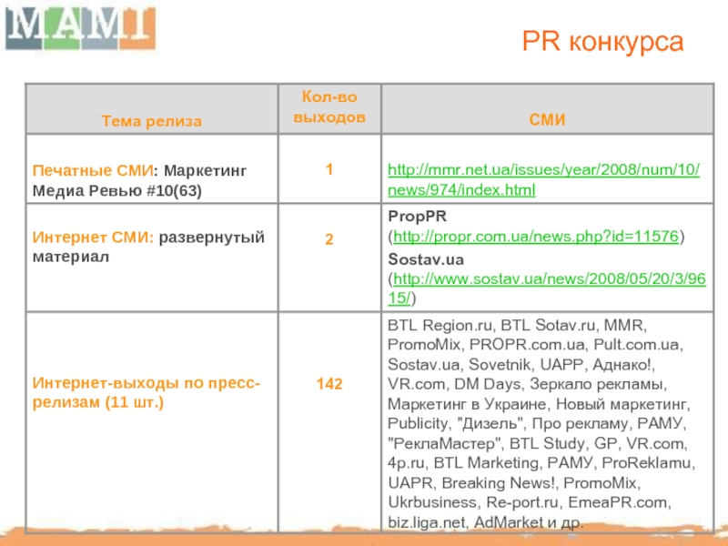 PressRelease, PRLife, PR-news, PROEvent, Sovetnik, ProPR, ProReklamu, Re-port, Зеркало Рекламы, Рекламастер, Новый маркетинг, BTLReport, BTLSostav, UkrBisness, UkrBiz, “Маркетинг и реклама”, “Международная маркетинговая группа”, Агентство корпоративных новостей.