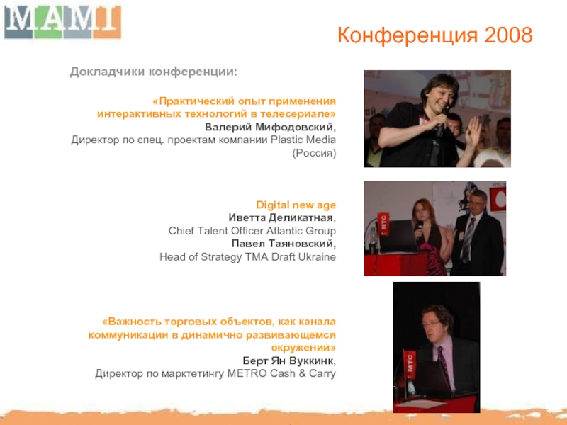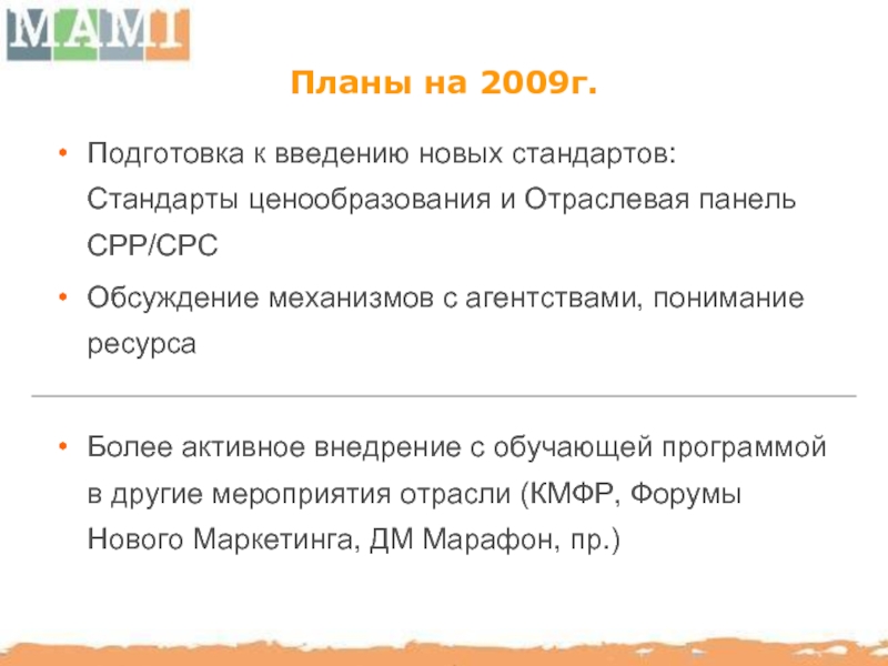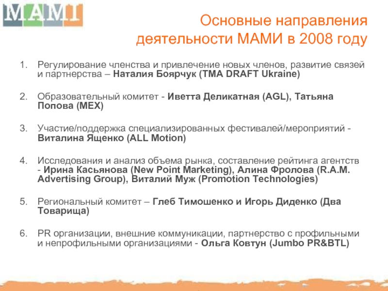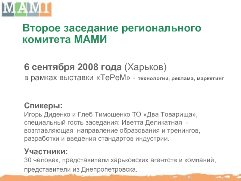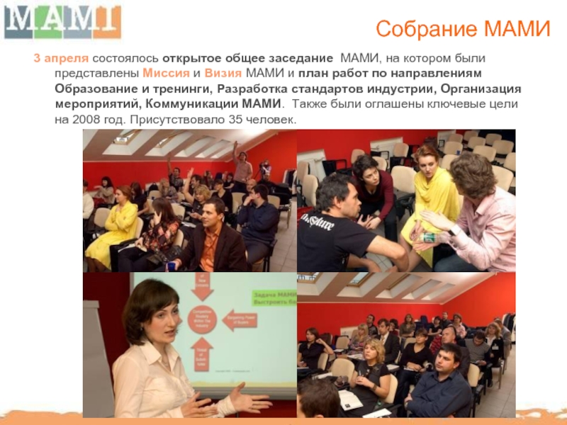 представлены Миссия и Визия МАМИ и план работ по направлениям Образование и тренинги, Разработка стандартов индустрии, Организация мероприятий, Коммуникации МАМИ. Также были оглашены ключевые цели на 2008 год. Присутствовало 35 человек.
