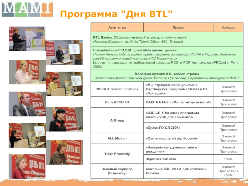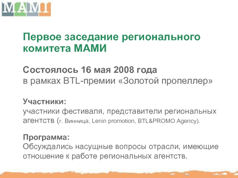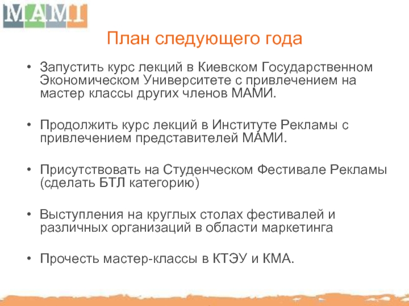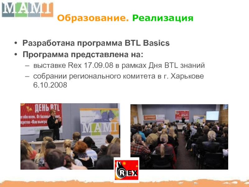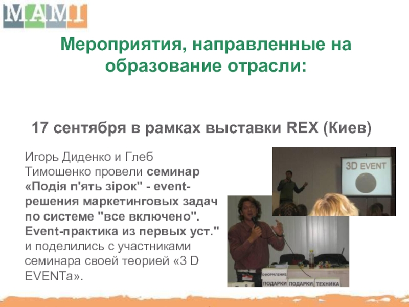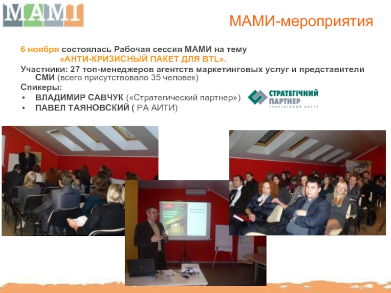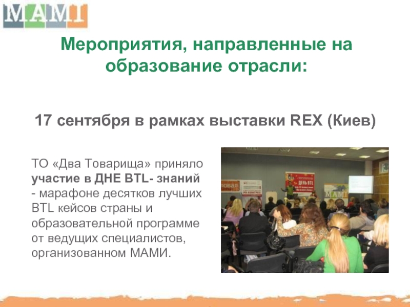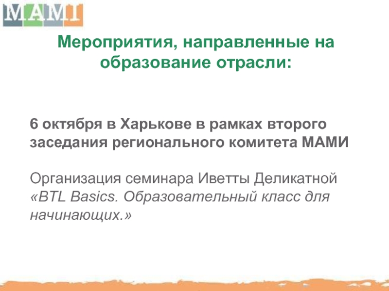 МАМИ способствует повышению профессионального уровня отечественного рынка BTL путем организации семинаров, мастер-классов с участием украинских и иностранных консультантов.