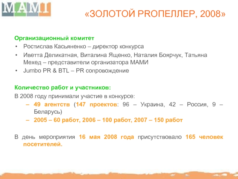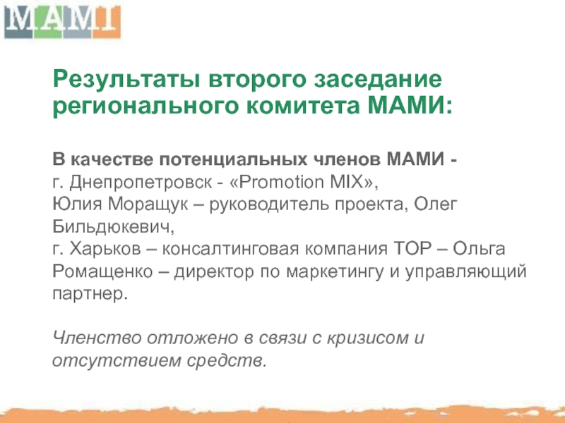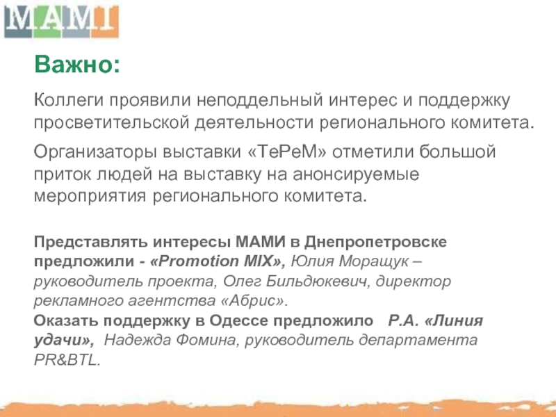 Представлять интересы МАМИ в Днепропетровске предложили - «Promotion MIX», Юлия Моращук – руководитель проекта, Олег Бильдюкевич, директор рекламного агентства «Абрис».