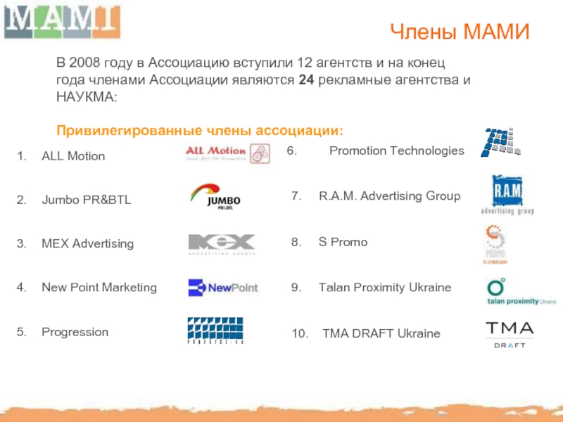 В 2008 году в Ассоциацию вступили 12 агентств и на конец года членами Ассоциации являются 24 рекламные агентства и НАУКМА: