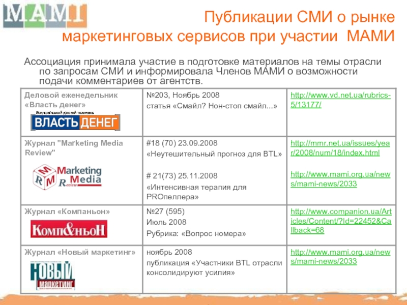 лояльности и заинтересованности СМИ к деятельности МАМИ и ее членов.