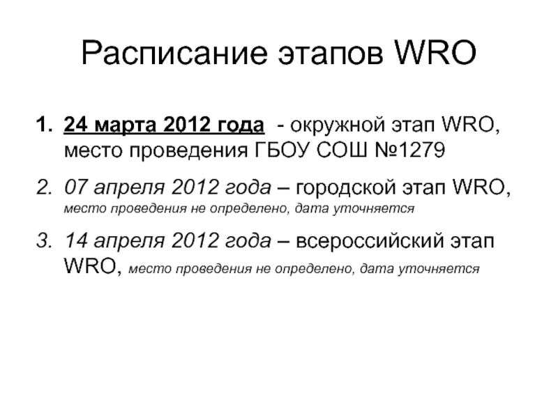 Слайд 33Расписание этапов WRO