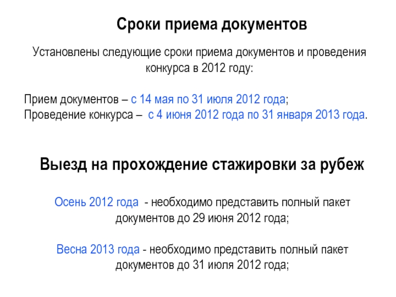 Осень 2012 года - необходимо представить полный пакет документов до 29 июня 2012 года;