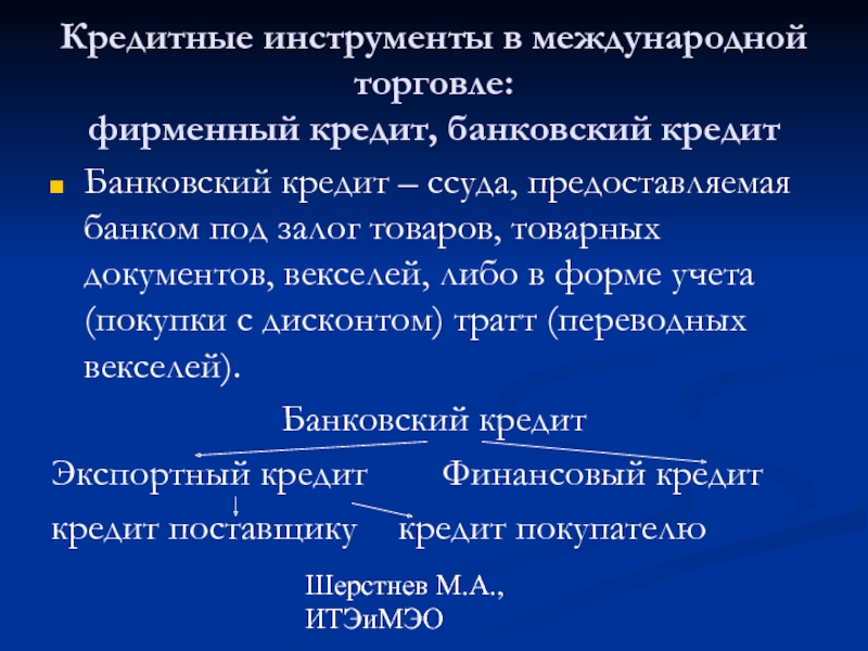 кредит – ссуда, предоставляемая банком под залог товаров, товарных документов, векселей, либо в форме учета (покупки с дисконтом) тратт (переводных векселей).