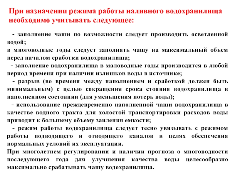При назначении режима работы наливного водохранилища необходимо учитывать следующее: