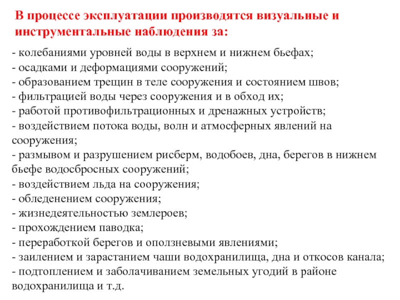 В процессе эксплуатации производятся визуальные и инструментальные наблюдения за: