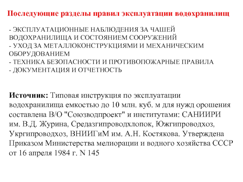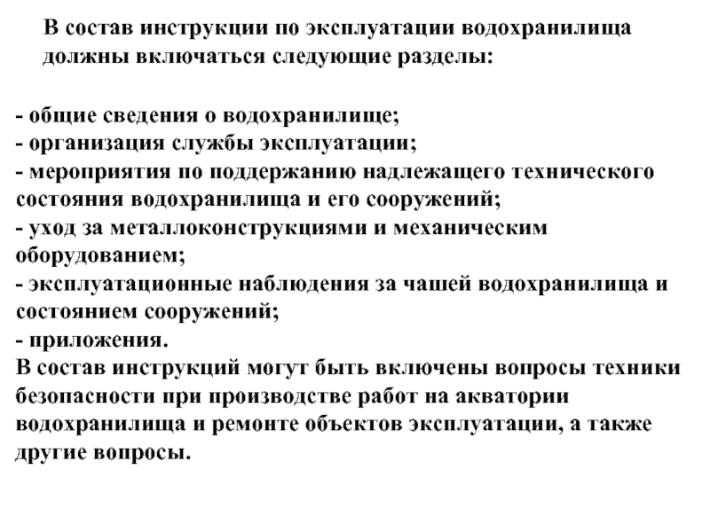 В состав инструкции по эксплуатации водохранилища должны включаться следующие разделы: