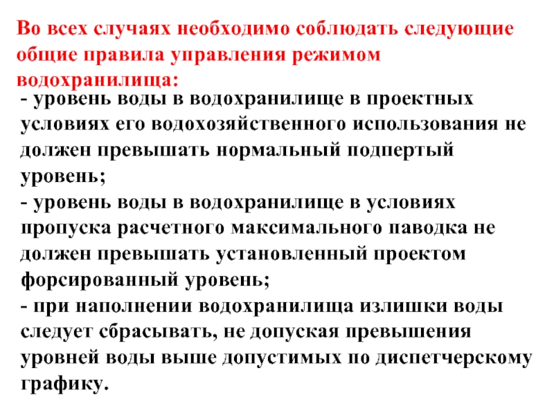 Во всех случаях необходимо соблюдать следующие общие правила управления режимом водохранилища: