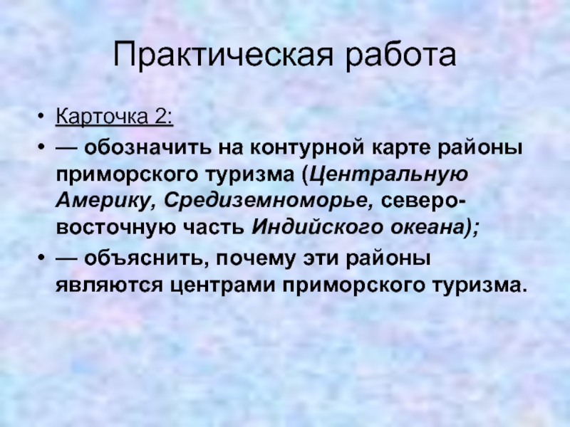 — обозначить на контурной карте районы приморского туризма (Центральную