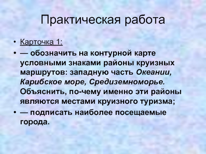 маршрутов: западную часть Океании, Карибское море, Средиземноморье. Объяснить, почему именно эти районы являются местами круизного туризма;