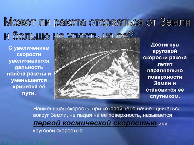 Достигнув круговой скорости ракета летит параллельно поверхности Земли и становится её спутником.