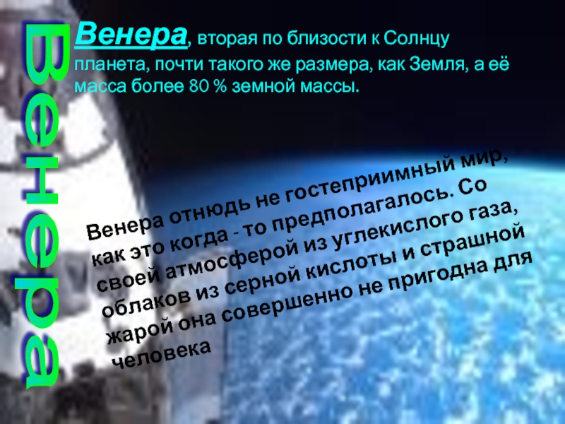 Венера отнюдь не гостеприимный мир, как это когда - то предполагалось. Со своей атмосферой из углекислого газа, облаков из серной кислоты и страшной жарой она совершенно не пригодна для человека