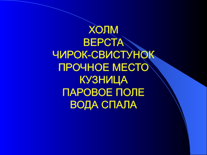 Слайд 3ХОЛМ ВЕРСТА ЧИРОК-СВИСТУНОК ПРОЧНОЕ МЕСТО КУЗНИЦА ПАРОВОЕ ПОЛЕ ВОДА СПАЛА