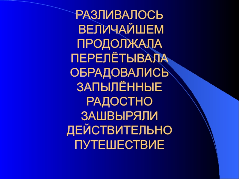 Слайд 4РАЗЛИВАЛОСЬ ВЕЛИЧАЙШЕМ ПРОДОЛЖАЛА ПЕРЕЛЁТЫВАЛА ОБРАДОВАЛИСЬ ЗАПЫЛЁННЫЕ РАДОСТНО ЗАШВЫРЯЛИ ДЕЙСТВИТЕЛЬНО ПУТЕШЕСТВИЕ