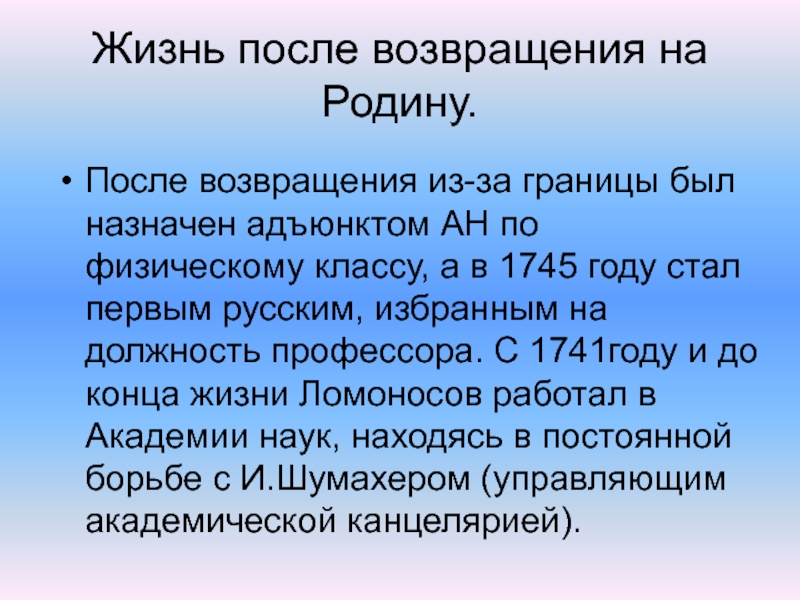 АН по физическому классу, а в 1745 году стал первым русским, избранным на должность профессора. С 1741году и до конца жизни Ломоносов работал в Академии наук, находясь в постоянной борьбе с И.Шумахером (управляющим академической канцелярией).