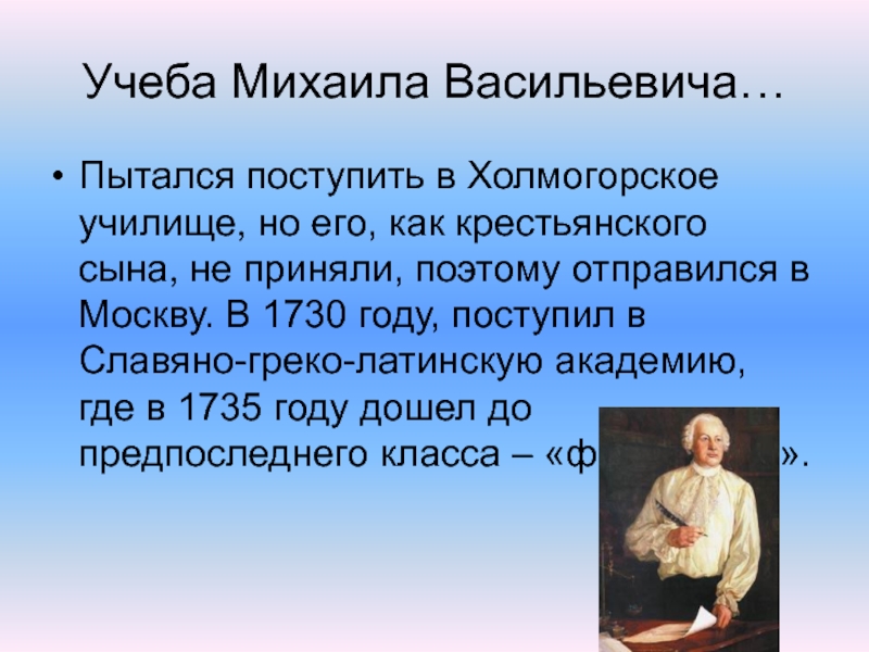 Пытался поступить в Холмогорское училище, но его, как крестьянского