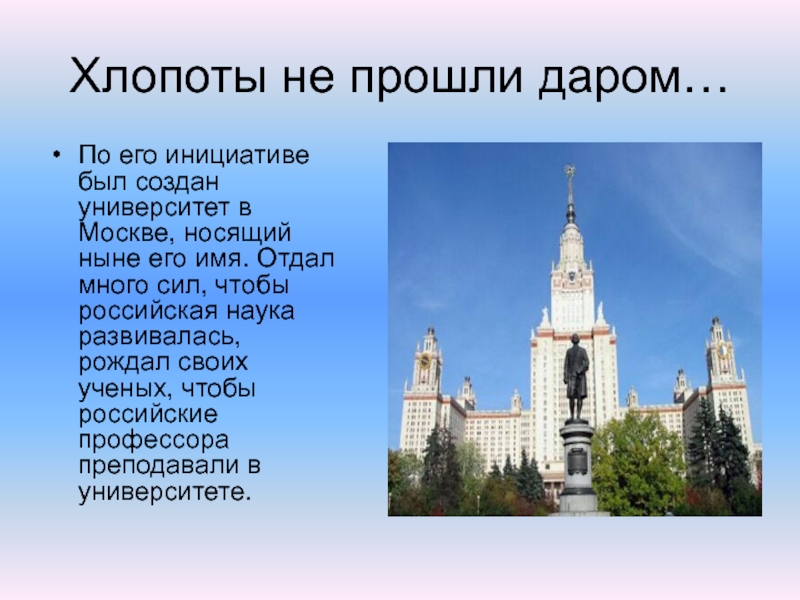 носящий ныне его имя. Отдал много сил, чтобы российская наука развивалась, рождал своих ученых, чтобы российские профессора преподавали в университете.