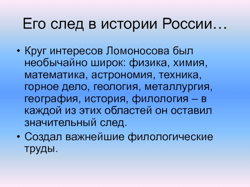 химия, математика, астрономия, техника, горное дело, геология, металлургия, география, история, филология – в каждой из этих областей он оставил значительный след.