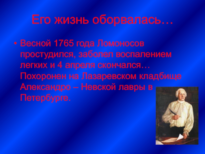 Весной 1765 года Ломоносов простудился, заболел воспалением легких и