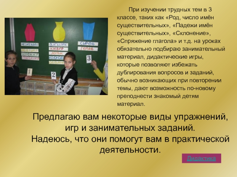 При изучении трудных тем в 3 классе, таких как «Род, число имён существительных», «Падежи имён существительных», «Склонение», «Спряжение глагола» и т.д. на уроках обязательно подбираю занимательный материал, дидактические игры, которые позволяют избежать дублирования вопросов и заданий, обычно возникающих при повторении темы, дают возможность по-новому преподнести знакомый детям материал.