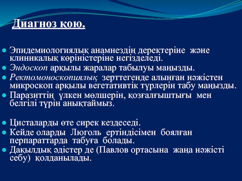 Ректомоноскопиялық зерттегенде алынған нәжістен микроскоп арқылы вегетативтік түрлерін табу маңызды.