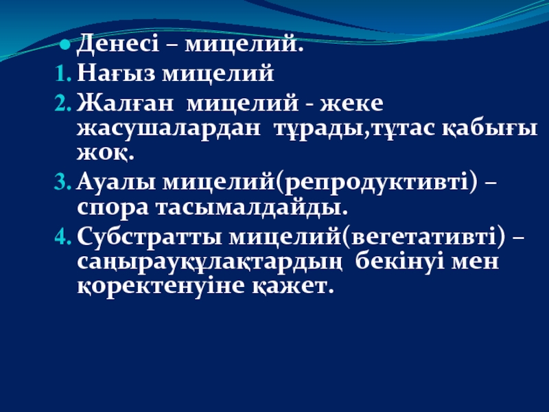 Субстратты мицелий(вегетативті) –саңырауқұлақтардың бекінуі мен қоректенуіне қажет.