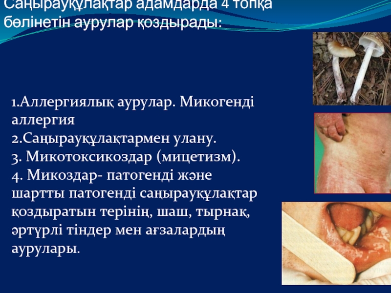Слайд 4 Саңырауқұлақтардың әсерінен адамның инфекциялық зақымдалуын – МИКОЗДАР дейді.